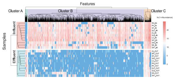 图2:进出水配对样本中差异特征污染物的丰度分布与聚类热图
